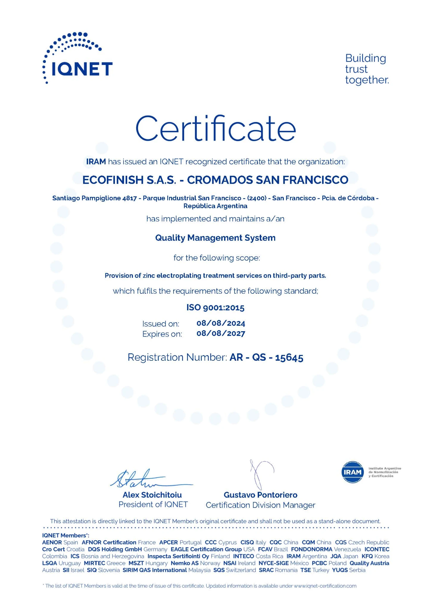 El alcance actual de la certificación comprende la "prestación de servicios de tratamiento de zincado electrolítico en piezas de terceros", asegurando procesos controlados, trazabilidad y consistencia en los resultados.